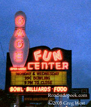 The marquee for the Gage Bowl in Topeka, KS still features neon in great working order. The Gage Bowl has been in business for over 40 years, opening in 1960. Here's the website for the Gage. 10-05