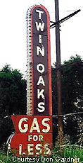 The Twin Oaks Gas For Less is a rather rudimentary marquee which