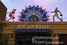 The Pin-up Bowl in St Louis, MO is a new era bowling alley. By the looks of the marquee atop the roof, this bowling alley was built along the same lines as its predecessors. 10-05