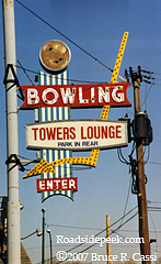 The White Way Sign Company provided this sign for the east side of the building advertising Towers Lounge. The bowling ball on top was motorized and an 8 ball was painted on the other side. 04-07