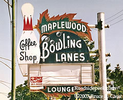 Like many other Chicago bowling alleys, Maplewood Bowling Lanes shut their doors in the mid 1990's. The sign structure was repainted brown and reused by the next business, minus the bowling pin of course. This one was manufactured by Lynch Sign Company. 06-07