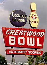 UPDATE 01/11 : The Crestwood Bowl sign dates back to 1958. Unfortuntely, the neon was taken off the sign in 2009 however the sign remains lit with a spotlight. Many thanks to Chet Wilson for update. 01-11