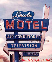 in towards its lodging. This sign is one of the survivors along the main Lincoln route in the Windy City. The Lincoln Mtoel was built in 1958 and still features its grand marquee complete with neon lettering and a big swooping arrow.