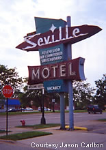 Here's a shot of the Seville Motel in Chicago. This motel features a cool sign out in front with very descriptive lettering.