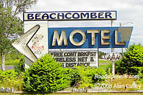 This old motel sign stands outside of the Beachcomber motel. Though the sign is somewhat faded, in fact the neon may have disappeared off the letters and the large boomerang arrow, the mote is still in business offering free breakfast and wireless internet. Interesting how the old roadside motels continue to change with the times in order to keep up with the big chains. 12-08