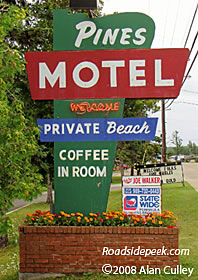 The Pines Motel is still open for business but is currently for sale. The neon is gone from the sign and may have been known by another name judging by the neon tube holes. 12-08