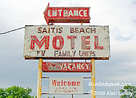 The Satis Beach Motel is closed and for sale. From the looks of the sign, the neon appears to be gone from the majority of the lettering and the sun is faded out after years showing the way to the motel.