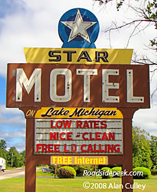 The Star Motel features a marquee with character. Located in Manistique, MI, the star shows off its roadside sign while still advertising current amenities like free internet. 12-08