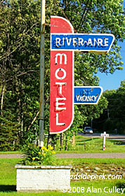 Here is the marquee for the River-Aire Motel standing tall in Sault Ste Marie, MI. At first it appeared that there was just a sign remaining, but back behind the house there was building with what looked to be 3 or 4 motel units. It wasn't clear if the motel was open or not. The sign has some of the tubing missing. 12-08