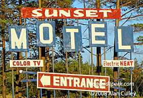 I was by this place twice in June and once in August and never anyone or any cars around, but the grounds at the place always was mowed. Not sure if the Sunset Motel is closed these days or if its still in business. 12-08