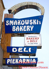 Check out this roadside sign for Smakowski's Bakery in Chicago, IL. This sign looks familiar to the Village Bake Shop sign and appears to be the new business that moved in. The clock that hadn't been working appears to be replaced or covered by the phone number to the business. 01-06