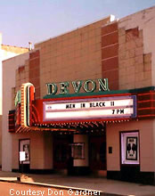 lights up in full neon at night. The Devon Theatre originally opened in the 1930's.
