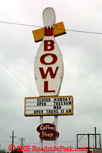 This old time bowling alley sign is located at Medford Lanes in Oregon. Check out the bowling ball that looks like a happy face atop