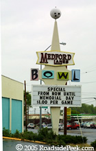 UPDATE 04/17 : The marquee for the Medford Lanes has been replaced by a back-lit plastic sign. 04-17