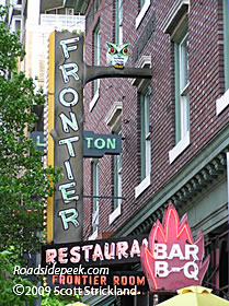 This place is also known as the Frontier Room and features a bar as well as Bar-B-Q fare.