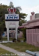 the Imperial Motel. Red neon lights up around the crown at night. This