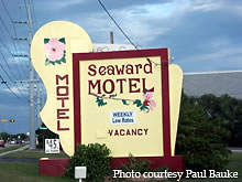 Another motel in the Florida Keys, the Seaward Motel's marquee and colors stand out during this overcast day.