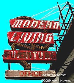 Check out this old sign at the Modern Living Furniture store in Louisville, KY. From the looks of it, the neon has long been gone from this sign and the bulbs have popped off the gold arrow. Not sure if this place is still in business these days. 05-09