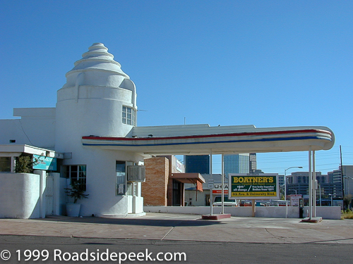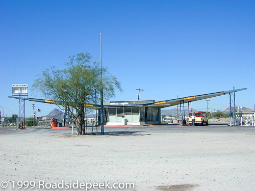 Check out the boomerang canopy on this gas station which was likely a Phillips 66 "gull wing" variety. The Blue Flame Gas off the old Benson Highway is noteworthy for its awnings that scream of the mid-century when it was likely built.