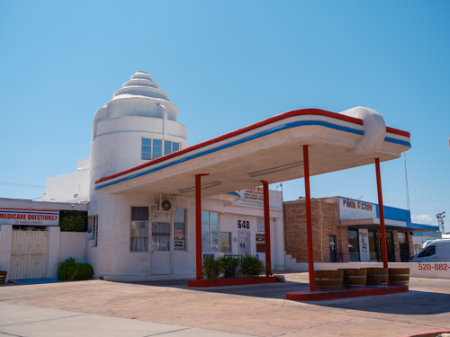 Check out this eye-catching art deco looking gas station found off the side of the main highway in Tucson. The gas station was built in 1936 and was home to various gas station brands including 76, Exxon and Shell. After a stint as a tax place, lately it appears to be a bail bond place. 07-22