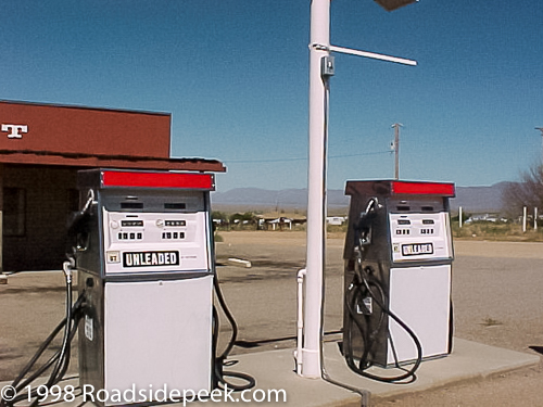 Located just east of Kingman, AZ is the town of Golden Springs. Located here is an old gas station called the The Outpost. The place appeared closed and there were some historic pumps still on site. The location looked this way for several years.