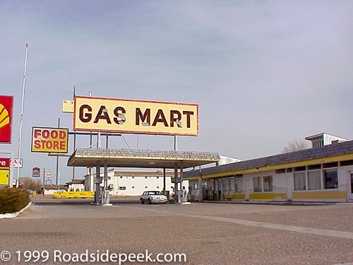 Here's an old station that is home to the Shell Gas Mart. Also featuring a food store, this Shell was found along old Route 66 in Holbrook, AZ. Check out the large sign above the canopy. 09-21