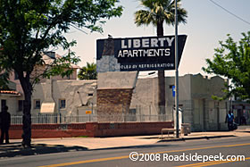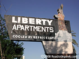The Liberty Motel and Apartments was a very well known Phoenix motel that was a nice place to stay back in the day. With its theme punctuated by a sign that featured the statue of liberty, the motel caught the eye of many tired motorists looking to spend the night. Unfortunately the Liberty, like the other motels in the area, became run down and was eventually demolished. The place is now an empty lot. 11-20