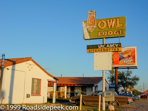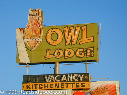 UPDATE 04/09 : The Owl Lodge in Tucson, AZ has now been turned into apartments, like many of the other old non-chain roadside motels in the area. The sign for the Owl Lodge remains and appears to have been recently restored. Unfortunately the sign no longer lights up.