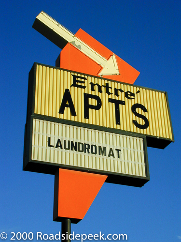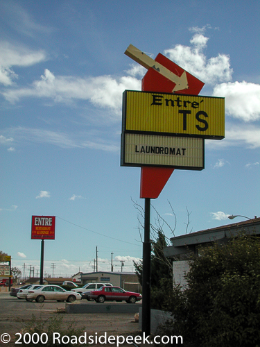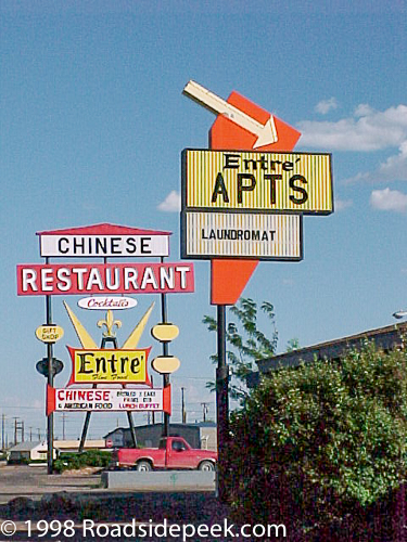 This cool sign for the Entre Apts as well as the Entre Restaurant in the background used to be an eye catcher of a sign off Route 66 in Winslow AZ. Located near the Delta Motel on the west end of town, the colors on this sign made this area a must stop for photography. The Entre Apts was actually a motel in its past. The owner of the Entre Restaurant built the Entre Motel back in 1976.