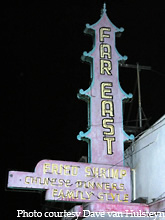 East restaurant marquee gives off an eerie glow. Well, it at least
