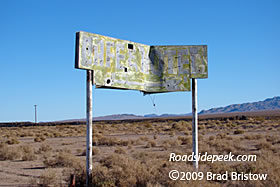 This old faded out and bent sign advertises a cafe and motel out in the middle of the Mojave. From the looks of the area around this sign, the structures are long gone though the marquee still remains. 11-09