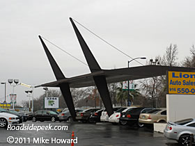 This mid-century gas station Lion Auto features the cantilevered beams that support the canopy probably used to cover the gas pumps. Today, the site is home to an auto sales business. 07-11