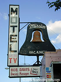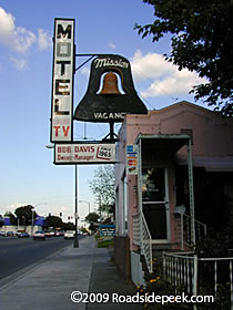 Check out the Mission Motel and its sign that carries the mission bell theme. The Mission Motel was a landmark roadside motel that shut down in recent years. Fortunately the sign itself has been reused for the new business. 02-10