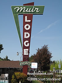 The marquee for the Muir Lodge in Martinez stands tall along the road. The colors of the sign match the around the area. 07-09