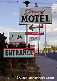 Check out the Tracy Motel and its sign that points the way to the lodging area with a familiar red arrow. 02-10