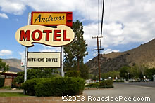 UPDATE 04/06 : The Andruss Motel is in Walker, California on US Hwy 395. The sign was erected in 1960 when Ray and Margaret Andruss bought "Hickson's Fish Camp" (built in 1957) and expanded the four room, knotty pine, rustic board and batten ranch style building into the "All modern...Water Cooled, Thermostatically Controlled Heat" with "Heated Pool, Lounge Room with TV, Inn Room Coffee, Excellent Hunting and Fishing Area, " 12 unit, birch paneling, modern American Motor Court. We are the seventh owners. -