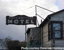 (Far left) A day shot of the White Cottage Motel sign showing off its orange sign