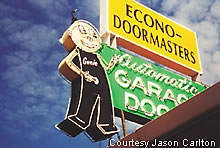 The sight of the rather interesting lookiing sign for the well known Econo-Doormasters marquee on the rooftop of the business features