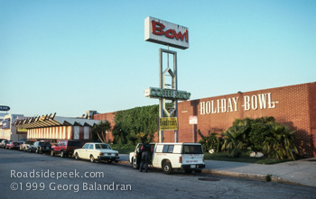 Unfortunately, the Holiday Bowl met its demise in 2003 and is the building has been repurposed to a Starbucks. See Roadside Peek'sSpotlight on the Holiday Bowl for more information. 03-99