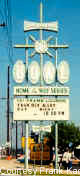 A keen example of the fate of our roadside treasures, the marquee of the Carter Bowl in Anaheim was changed in 1999 from the fabulous googie sign on the left (just look at those colors!) to the booorrrring marquee on the right. Another one bites the dust. 01-99