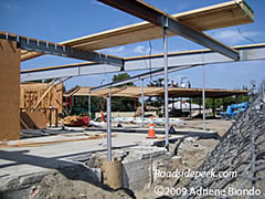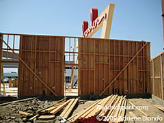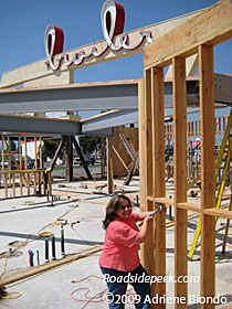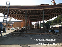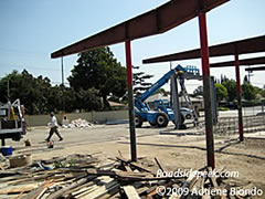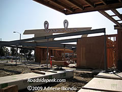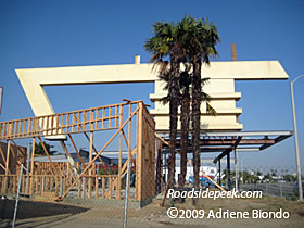 Former Johnie's Broiler Marquee as of May 11, 2009 On Friday a crane hoisted a massive 60 foot beam into place, and over the weekend the steel framework was assembled and wood framing started going up. It's surreal to be there in person and realize how amazing it is that this project is actually happening. Is there anyone out there who's rebuilding a 1950s Googie drive-in restaurant from the original blueprints?! Stay tuned, more to come. More photos from May 11, 2009 below.