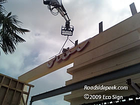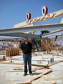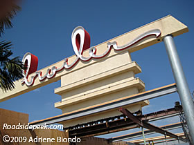 Welding activity underway at the Bob's Big Boy Broiler in Downey on May 14, 2009 To the right is a shot of the new brush script lettering for the "broiler" portion of the new marquee Broiler sign Below are many more photos taken on May 14, 2009. Many thanks to Adriene Biondo for the continual updates from the site and for these photos.
