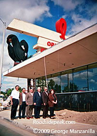 Two years after the illegal demolition of Johnie's Broiler, fans of the former Harvey's and Johnie's Broiler in Downey gathered at the Firestone Boulevard location Monday for the opening of the new Bob's Big Boy Broiler. New Big Boy Broiler Featuring a familiar huge car rooftop marquee, the Broiler has remained as true to its original roots as possible with authentic terrazzo flooring in the interior of the restaurant and carhop service during weekdays. More information can be found at cbs2.com and the Long Beach Press Telegram. Many thanks to Adriene Biondo for notification of opening and photo.