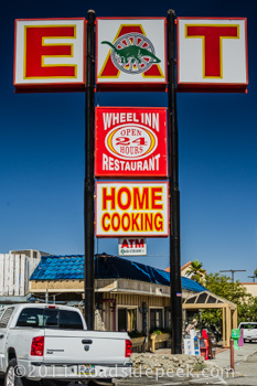 Travelers speeding near Palm Springs can't miss the "EAT" sign at the well known landmark The Wheel Inn Restaurant in Cabazon. Located next to the Cabazon Dinosaurs, The Wheel Inn has been a roadside establishment and diner like eatery with an Old West type of theme for more than 50 years. Movies have been filmed at this location, including a scene from Pee Wee's Big Adventure.