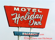 This sign for the Holiday Inn Motel in San Bernardino seems to capitalize on the familiar name. The lettering and colors of this sign are real eye-catchers.