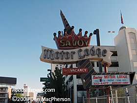 The city of Reno continues to modernize and mow down the cute little Route 66 type motels. All that is left of the Savoy Motor Lodge is this sign. Not sure why they didn't take it down, perhaps some collector wanted it. Many thanks to Dan MacPherson for photo and update. 12-08