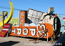 An old Denny's sign sits in the lot of the Neon Graveyard.