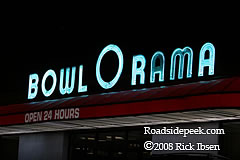 Off the Berlin Turnpike in Newington, CT is this old alley called the Bowl O Rama. Check out the neon letters, especially the big "O", as its glow catches the eye of drivers passing by. See this neon alley and more at Roadside Peek'sNeon Bowling East.