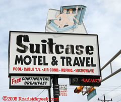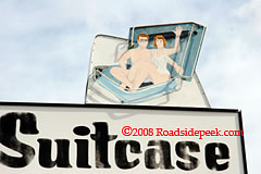 The Suitcase Motel features a distinct sign with a couple sun bathing in an open suitcase. Well, the couple look happy and relaxed as they vacation inside this piece of luggage. 03-08