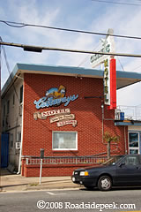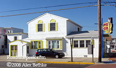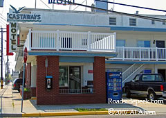 The Castaways Motel is a distinct roadside stop along Atlantic Avenue in Wildwood. Check out the distinct brightly painted marquee as well as the signage on the side of the motel building. It appears that the blade sign still has neon on it. 03-08